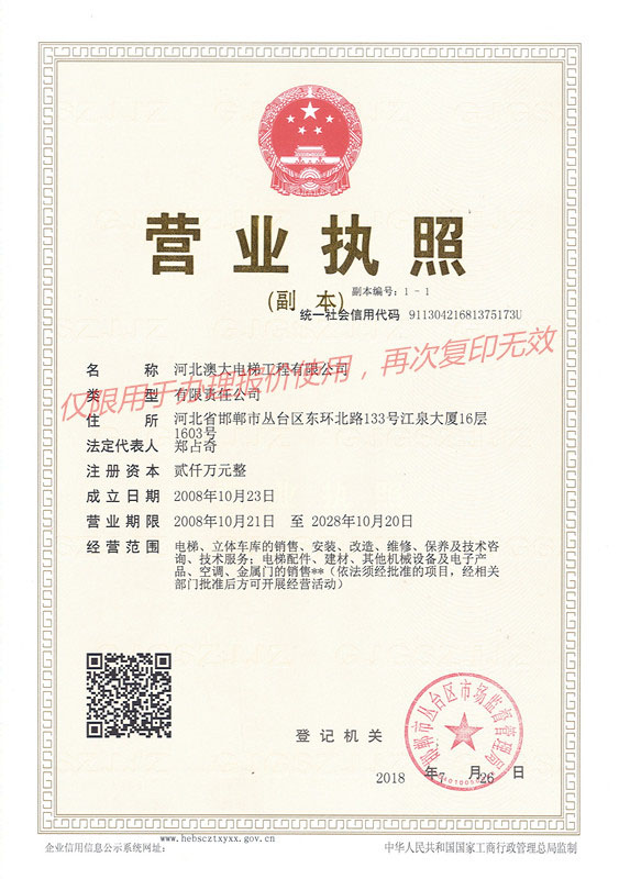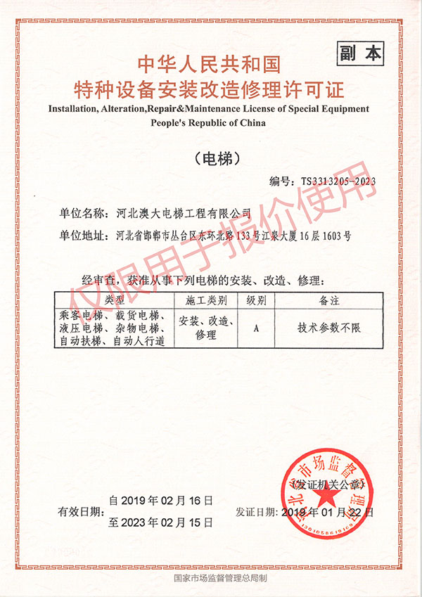 河北澳大電梯工程有限公司是集電梯銷售、安裝、維護保養(yǎng)為一體的專業(yè)化電梯公司。公司具有國家質(zhì)量監(jiān)督檢驗總局頒發(fā)的“電梯安裝改造維修A級”資質(zhì)許可證。下設市場部、工程部、維保部、技術(shù)部、行政部及電梯配件公司。
